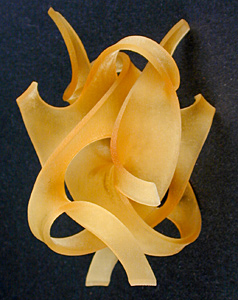 Meanwhile, as an experiment I'm having the stereolithography model shown below electroformed with copper. Electroforming works like electroplating, in that the piece is coated with conductive paint and then immersed in a bath of metal ions. But the coating laid down is much thicker, so that the metal becomes structural rather than just a finish coat. Nobody seems to have any clear idea whether this process will work for this piece; the question is whether the coating will be uniform enough.