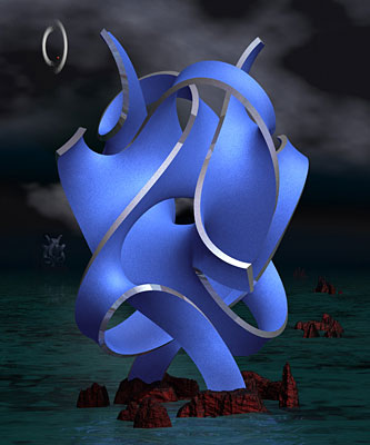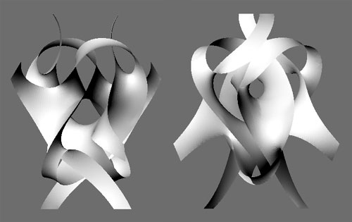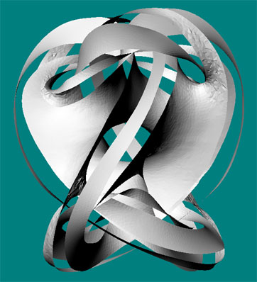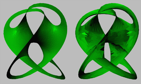 Guessing that the sculpture might be at or near a minimal-energy surface, I set Evolver to work on minimizing the energy of the jagged model. The result is above left: as the surface approaches minimal energy, it also approaches the sculpture. It was quite eerie to watch, as the piece pulled itself into shape without human intervention.