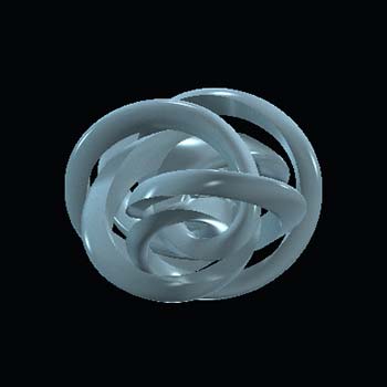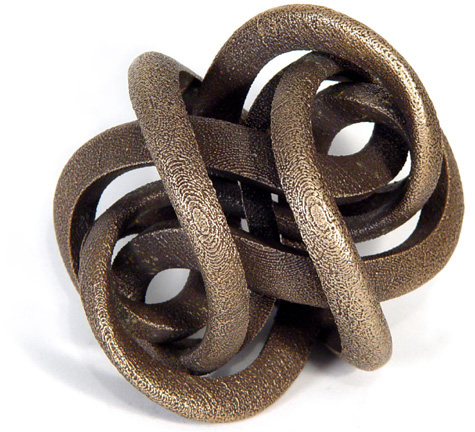 This piece is a complex knot, a single two-sided ribbon that follows itself through the form. Pulled out straight it would be over four feet long, but the steel-bronze composite metal used here gives it great toughness.