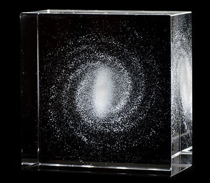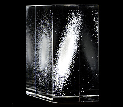 The Galaxy Crystal is a cosmic paperweight: an optically perfect glass block laser etched with a 3D model of the Milky Way.