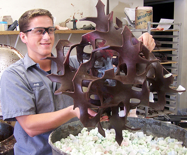Finished bronze – Screenshot of the model – In wax – Dipping the ceramic shell – Just cast! – Chasing – Finished