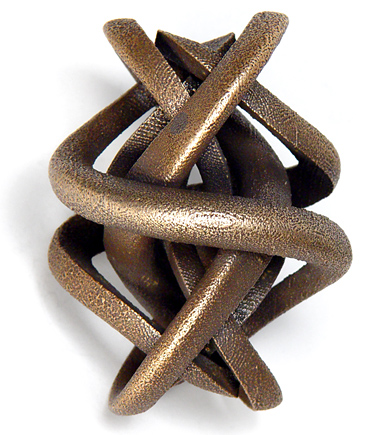 This piece is a complex knot, a single two-sided ribbon that follows itself through the form. Pulled out straight it would be over four feet long, but the steel-bronze composite metal used here gives it great toughness.